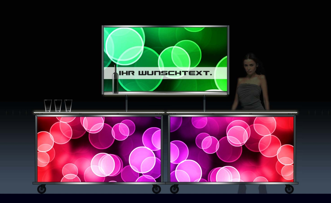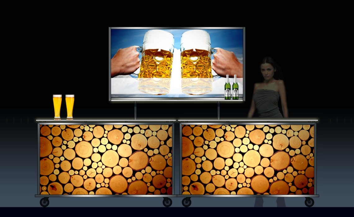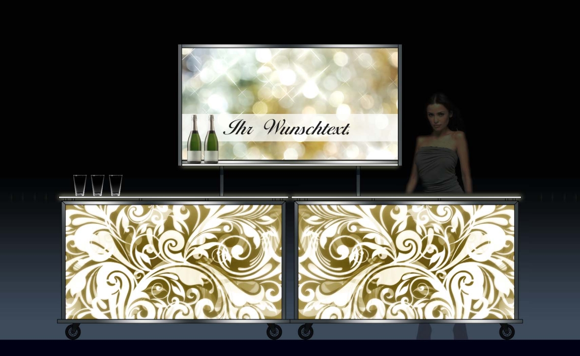 INDIVIDUELL: Wir liefern Ihre Mietbar mit Ihrem eigenen Motiv, inkl. Beratung durch unseren Grafiker. Auf Wunsch lagern wir den Motivdruck nach dem Verleih kostenfrei für Sie ein.